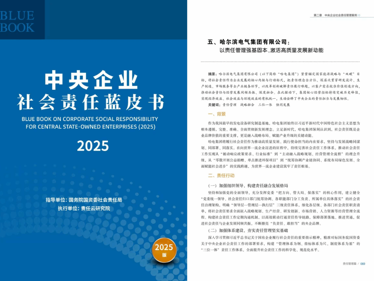近年來,哈電集團在責任管理與實踐領域成效顯著,多項關鍵指標表現突出:責任管理指數持續領跑行業,連續兩年榮獲“CSR鯨牛獎”責任品牌獎,獲評重點行業社會責任發展指數優秀企業與負責任產品指數十強,社會責任報告連續兩年獲評五星級評價。這些扎實的成果,生動詮釋了哈電集團作為中央企業的深厚責任擔當與高質量發展韌性。
