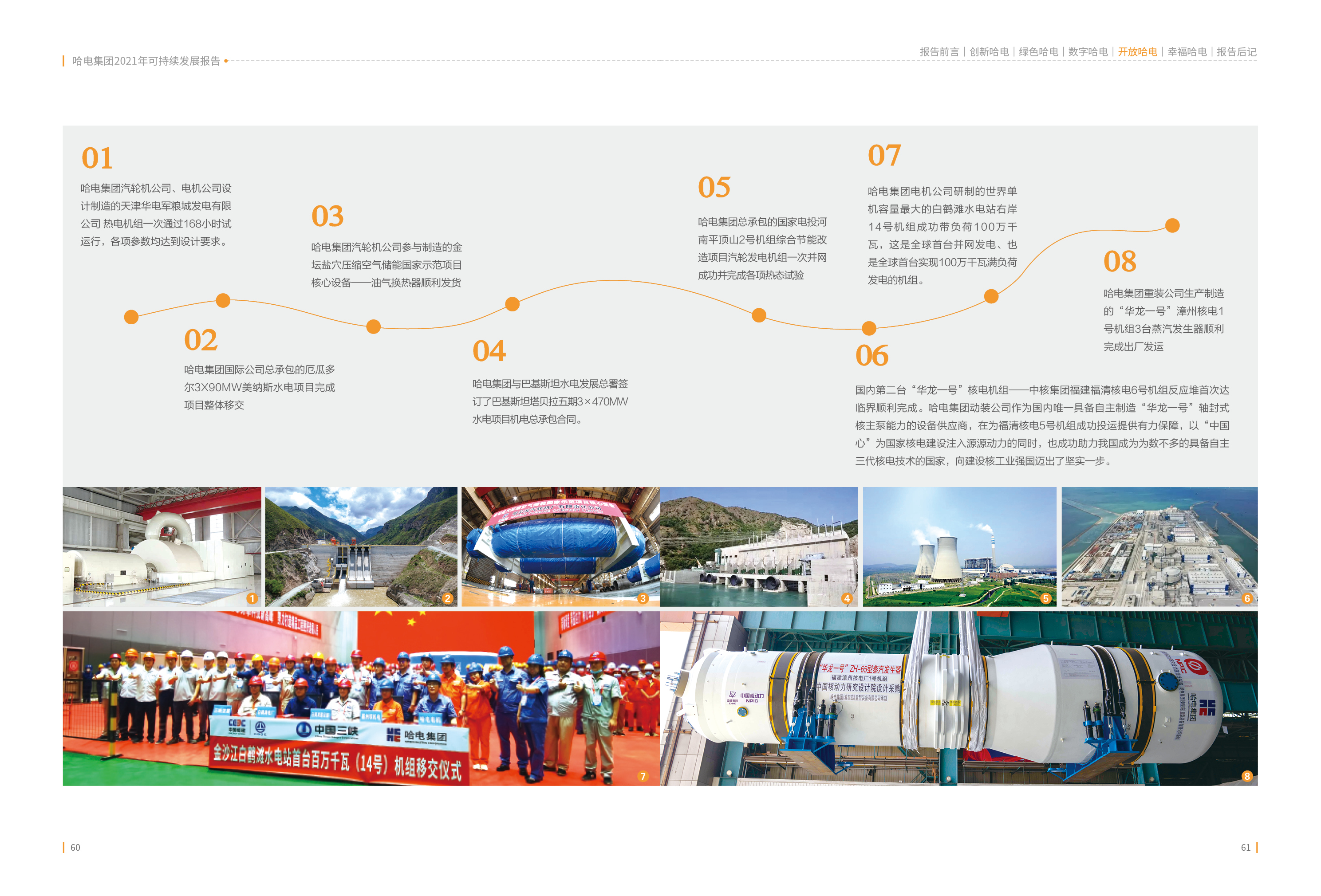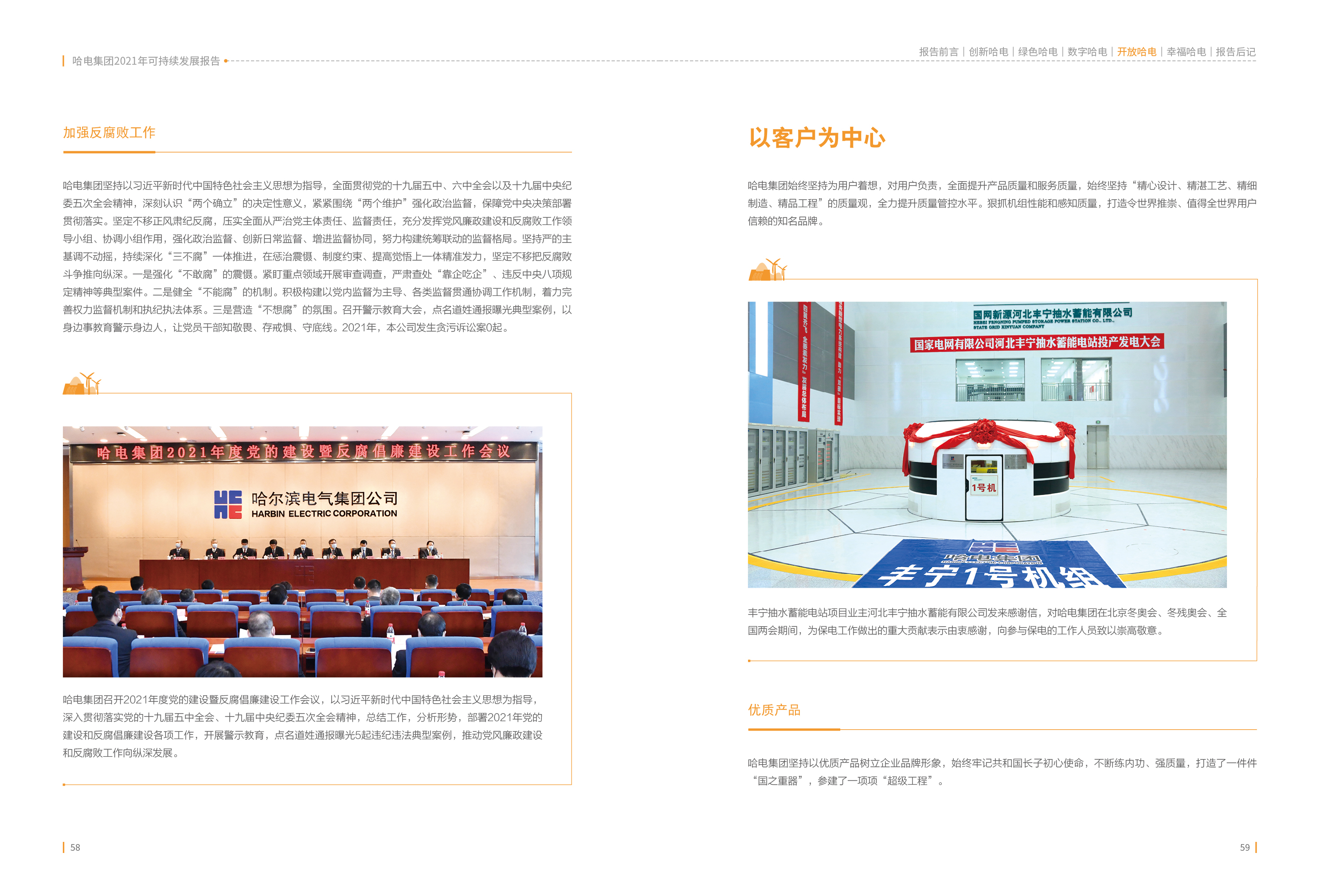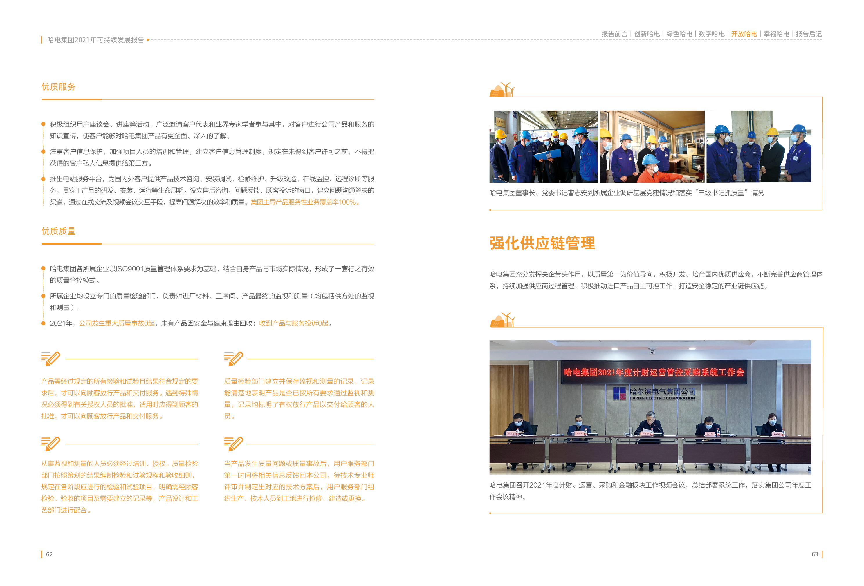 《哈電集團(tuán)2021年度可持續(xù)發(fā)展報告》以“創(chuàng)新哈電”、“綠色哈電”、“數(shù)字哈電”、“開放哈電”、“幸福哈電”為主體內(nèi)容,全面展現(xiàn)哈電集團(tuán)2021年在改革發(fā)展、客戶責(zé)任、貢獻(xiàn)社會、保護(hù)環(huán)境、愛護(hù)員工等方面取得的成績。通過“以高質(zhì)量黨建引領(lǐng)高質(zhì)量發(fā)展”、“70載書寫光榮與夢想”、“白鶴亮翅盡展大國重器——為全面踐行‘雙碳’戰(zhàn)略目標(biāo)貢獻(xiàn)哈電力量”、“履行政治責(zé)任、助力鄉(xiāng)村振興”、“沉淀企業(yè)文化、凝練哈電精神”五個責(zé)任專題,聚焦哈電集團(tuán)在黨建引領(lǐng)、70年發(fā)展歷程、打造精品工程、助力鄉(xiāng)村振興、沉淀企業(yè)文化等領(lǐng)域的重點工作成效,彰顯了中央企業(yè)的責(zé)任擔(dān)當(dāng)。