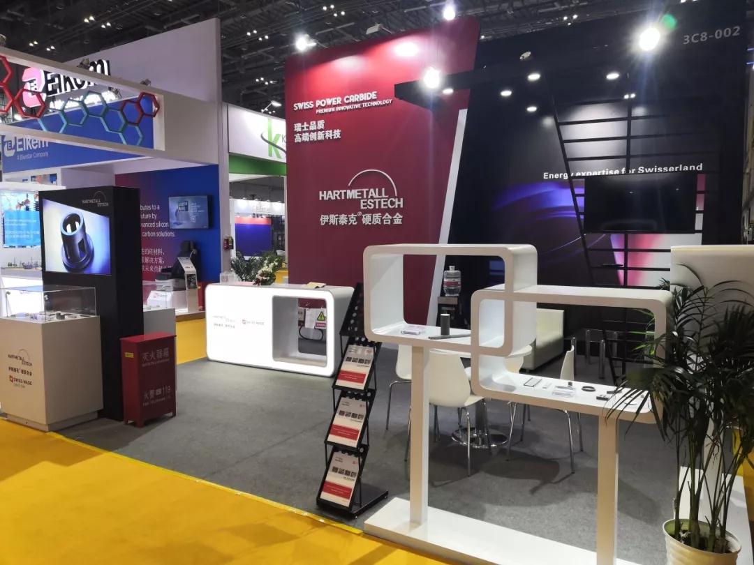 該展位分了2個展區,第一展區有兩個帶射燈的小柜子,柜里展出了各種牌號棒料,有帶孔的和不帶孔的,有介紹銘牌在邊上,剩下依次有圓鋸片、拉絲模、圓環、塊形料等,展品豐富,整體外觀很有質感,各部分壓制棱角分明;