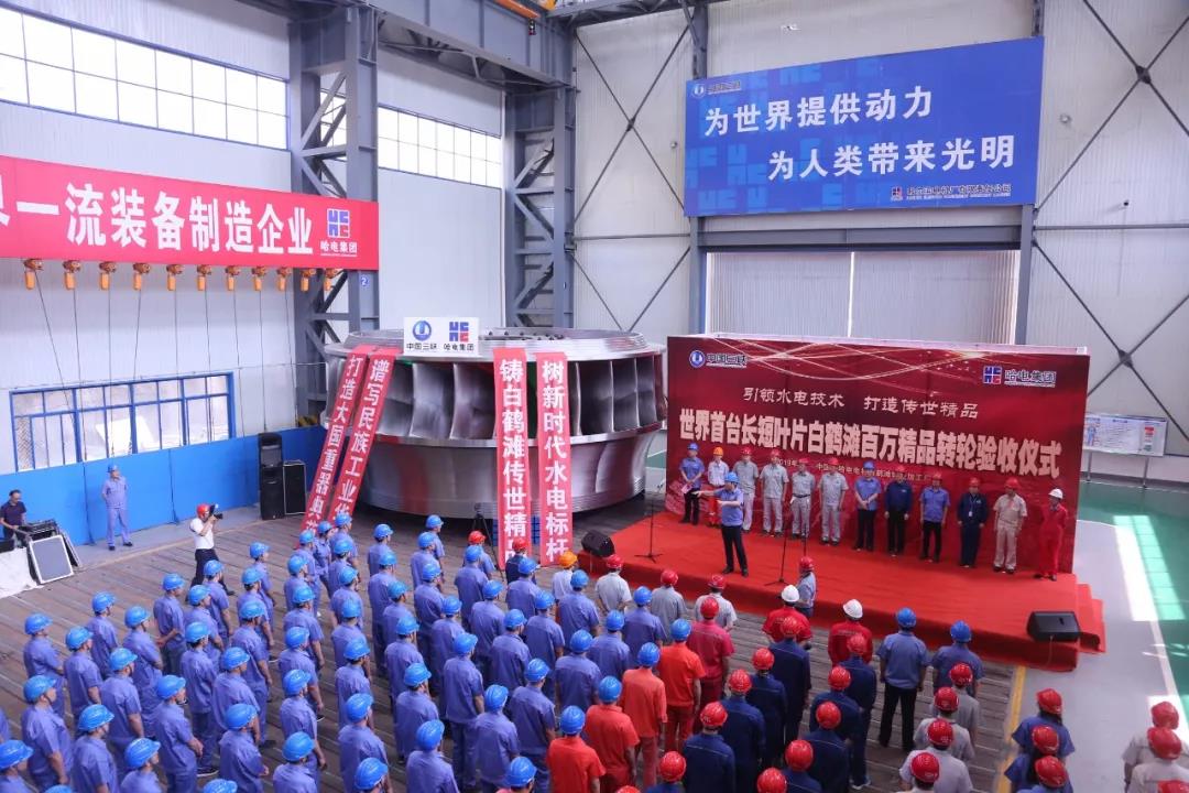 當日,在白鶴灘現場哈電電機轉輪加工廠,在這臺外圓8.87米、高3.79米、總重338噸的轉輪旁,哈電電機舉行了世界首臺長短葉片白鶴灘百萬精品轉輪驗收儀式。三峽機電工程技術有限公司、中國三峽建設管理有限公司、中國長江電力股份有限公司、長江三峽設備物資有限公司、長江三峽技術經濟發展有限公司,中國電建集團華東勘測設計研究院有限公司,中國葛洲壩集團機電建設有限公司以及哈電電機等各相關方負責同志出席驗收儀式。