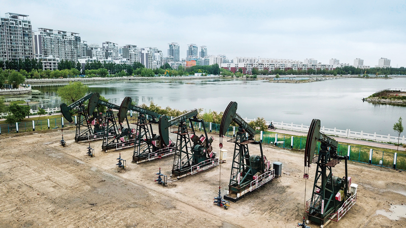 經(jīng)過半個多世紀(jì)艱苦創(chuàng)業(yè),大慶油田不僅扛起了“共和國加油機(jī)”的神圣職責(zé),為保障國家能源安全作出巨大貢獻(xiàn),而且著力打造了一座人與自然和諧相處、原油生產(chǎn)與環(huán)境保護(hù)相得益彰的“綠色油化之都”。圖為大慶油田叢式井坐落在市區(qū)燕都湖旁。 新華社記者 王建威/攝