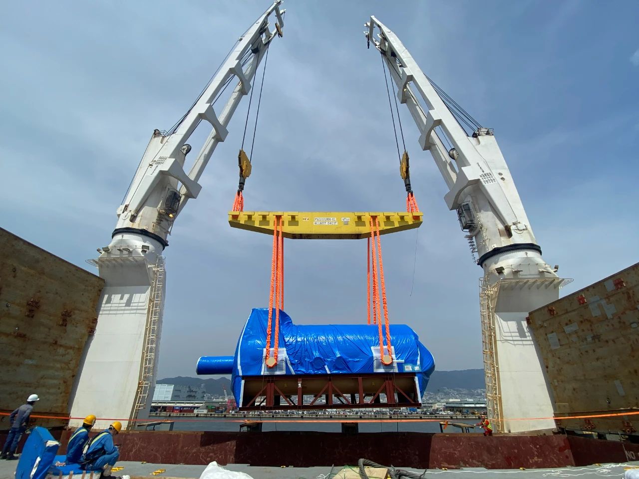 此次發運燃機重量達517噸,是哈電國際發運單體重量最大的設備,采用起吊能力達640噸的重吊船抬吊操作裝船。為確保操作過程絕對安全,哈電國際物流管理團隊在啟運前與物流分包商精心規劃操作方案,嚴格審核技術細節,對設備包裝、吊點重心、結構尺寸等細節與設備廠家充分交流,確保滿足核心設備裝船、綁扎、運輸過程的安全要求,同時積極協調,跟蹤對接船、貨狀態。最終按照發運計劃和操作方案要求,順利完成裝船發運。