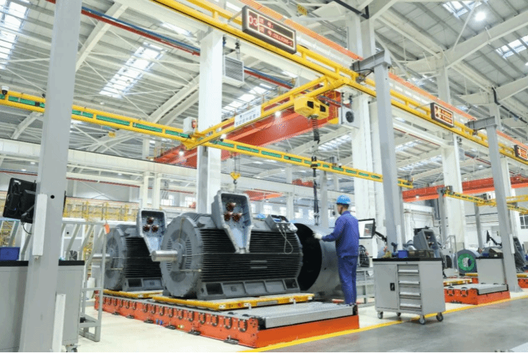 ★哈電集團高壓電機數(shù)字化裝配車間操作者正在使用KDK吊車進行裝配。