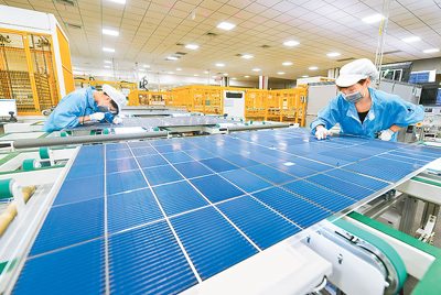 圖為安徽華晟新能源科技股份有限公司的異質結光伏電池及組件工廠內,技術人員在對產品進行檢測。 徐 勇攝(新華社發)