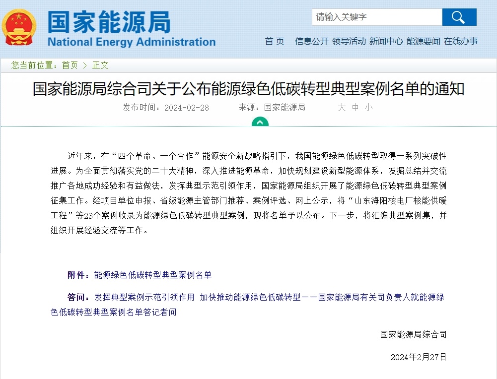 2月28日,國家能源局公布能源綠色低碳轉型典型案例名單,23個典型案例涵蓋能源生產供應、加工轉化、終端消費等各個環節,主要包括綠色能源供給新模式類、城市(鄉鎮)能源增綠減碳類、能源產業鏈碳減排類、用能企業(園區)低碳轉型類等四個類別,在各領域具有較強的代表性。