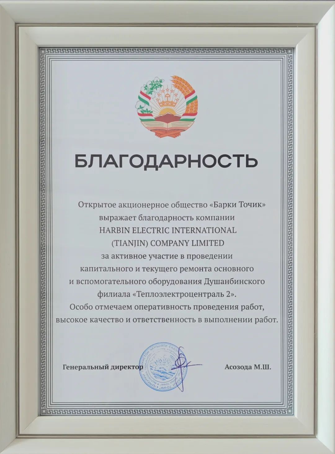 近日,哈電國(guó)際收到塔吉克斯坦共和國(guó)電力公司發(fā)來(lái)的感謝信,對(duì)哈電國(guó)際在杜尚別2號(hào)電廠檢修工作中展現(xiàn)的專業(yè)能力與責(zé)任擔(dān)當(dāng)給予高度評(píng)價(jià)。